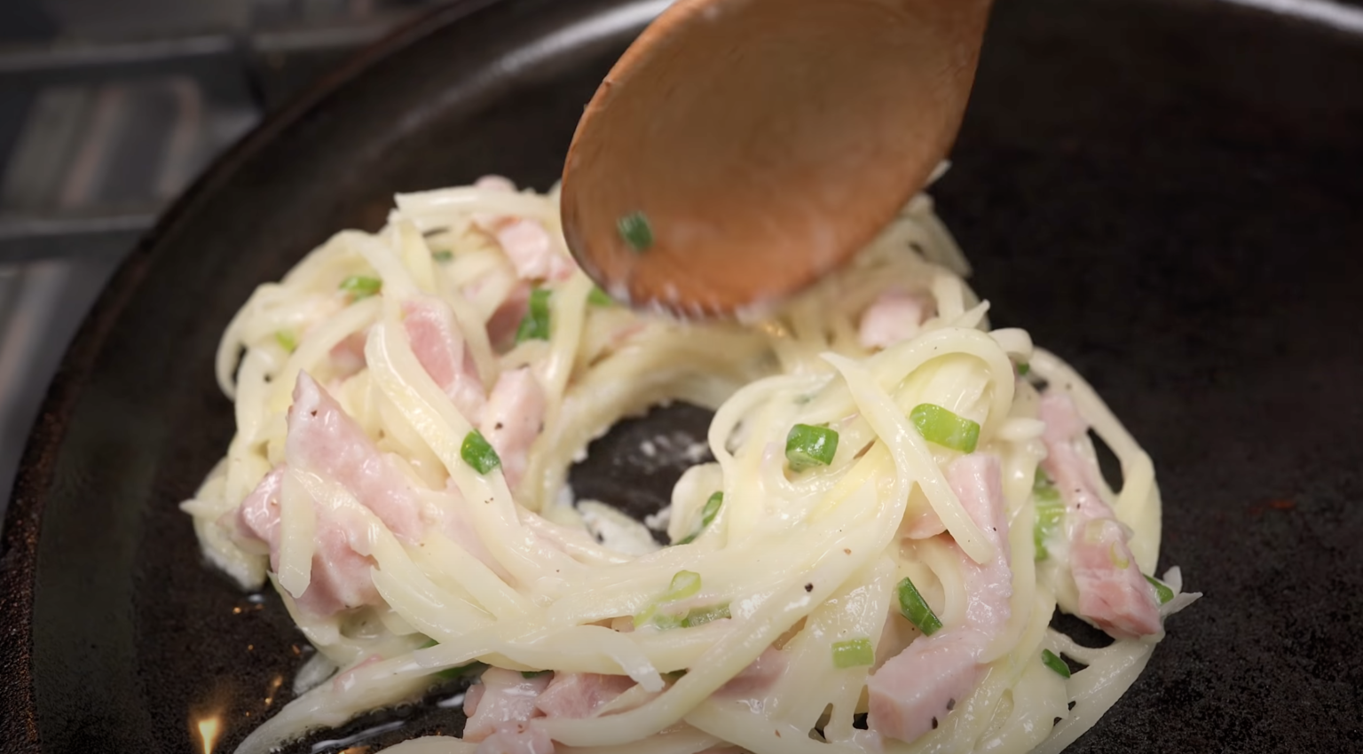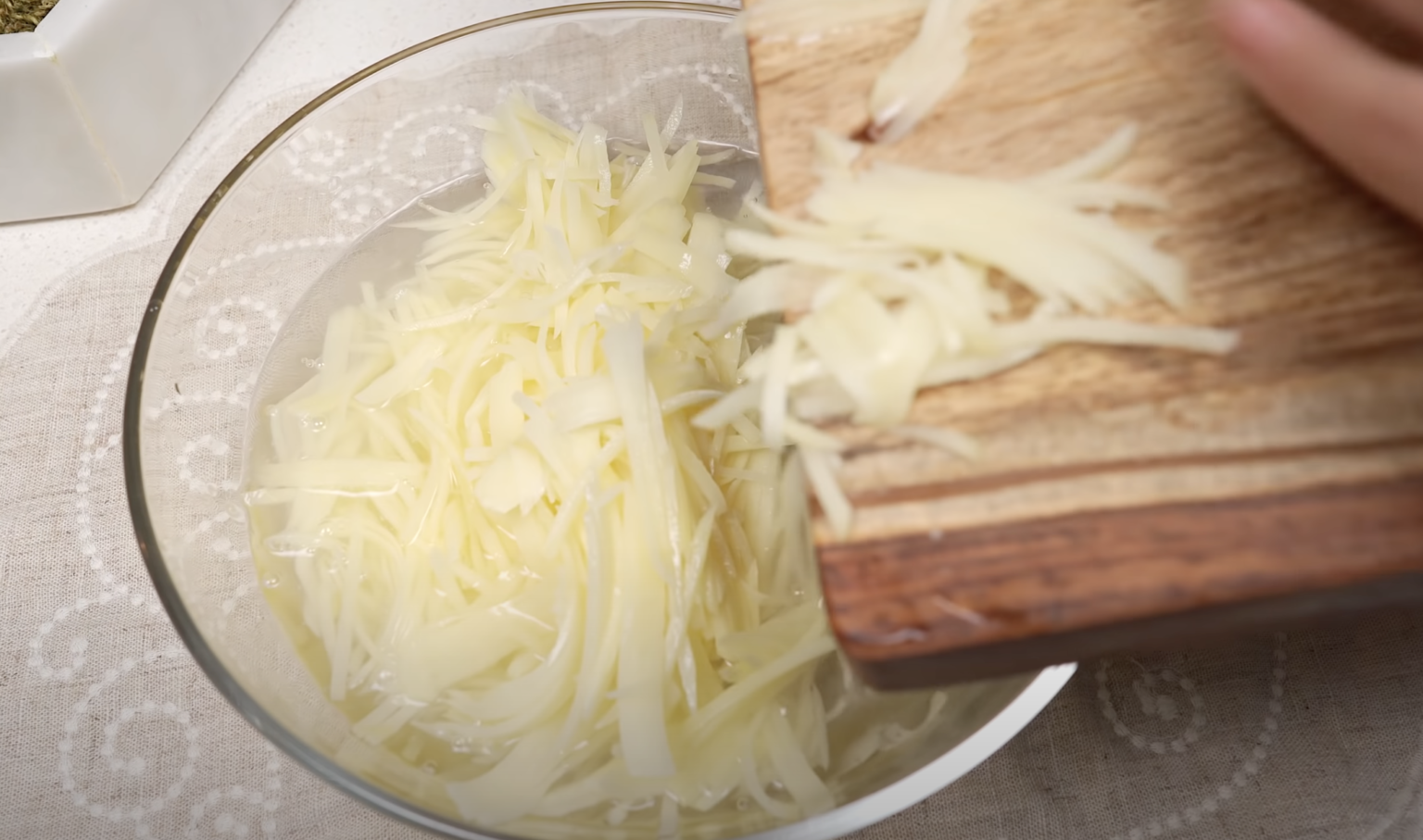 Następnie włóż je do zimnej wody i chwilę mocz, aby wypłukać skrobię. W międzyczasie pokrój szynkę i szczypiorek.