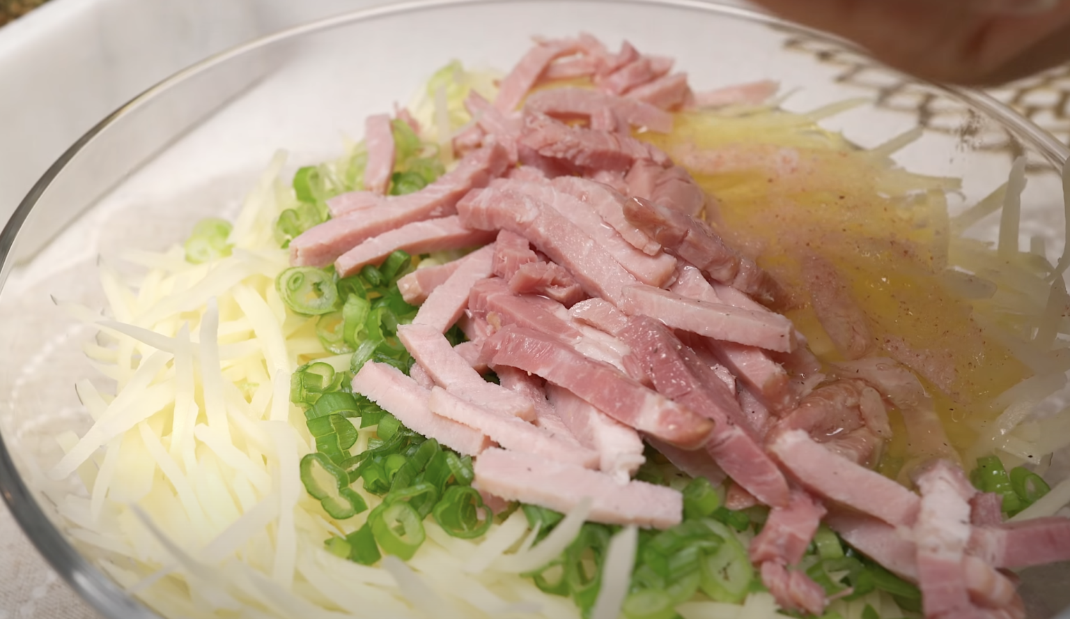 Dodaj również szynkę, cebulę, mąkę, sól oraz pieprz, wymieszaj. Podgrzej olej na patelni. Ułóż na niej mieszankę ziemniaczaną, po środku każdej zrób wgłębienie.
