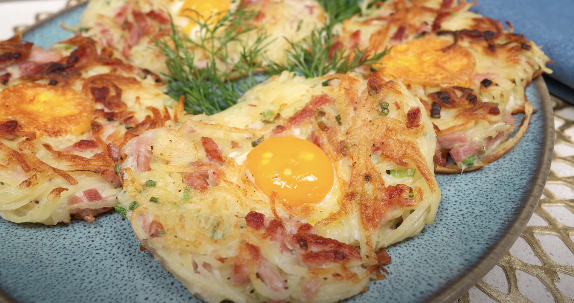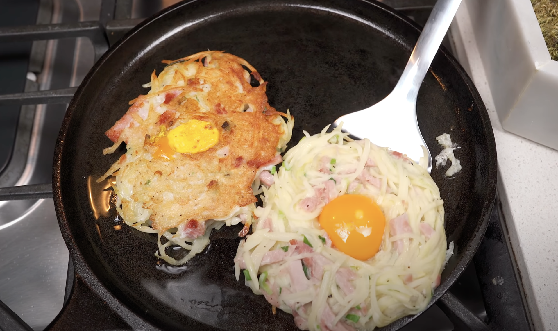 Pyszne danie z tartych ziemniaków, szynki i jajek. Idealna szybka kolacja dla całej rodziny.