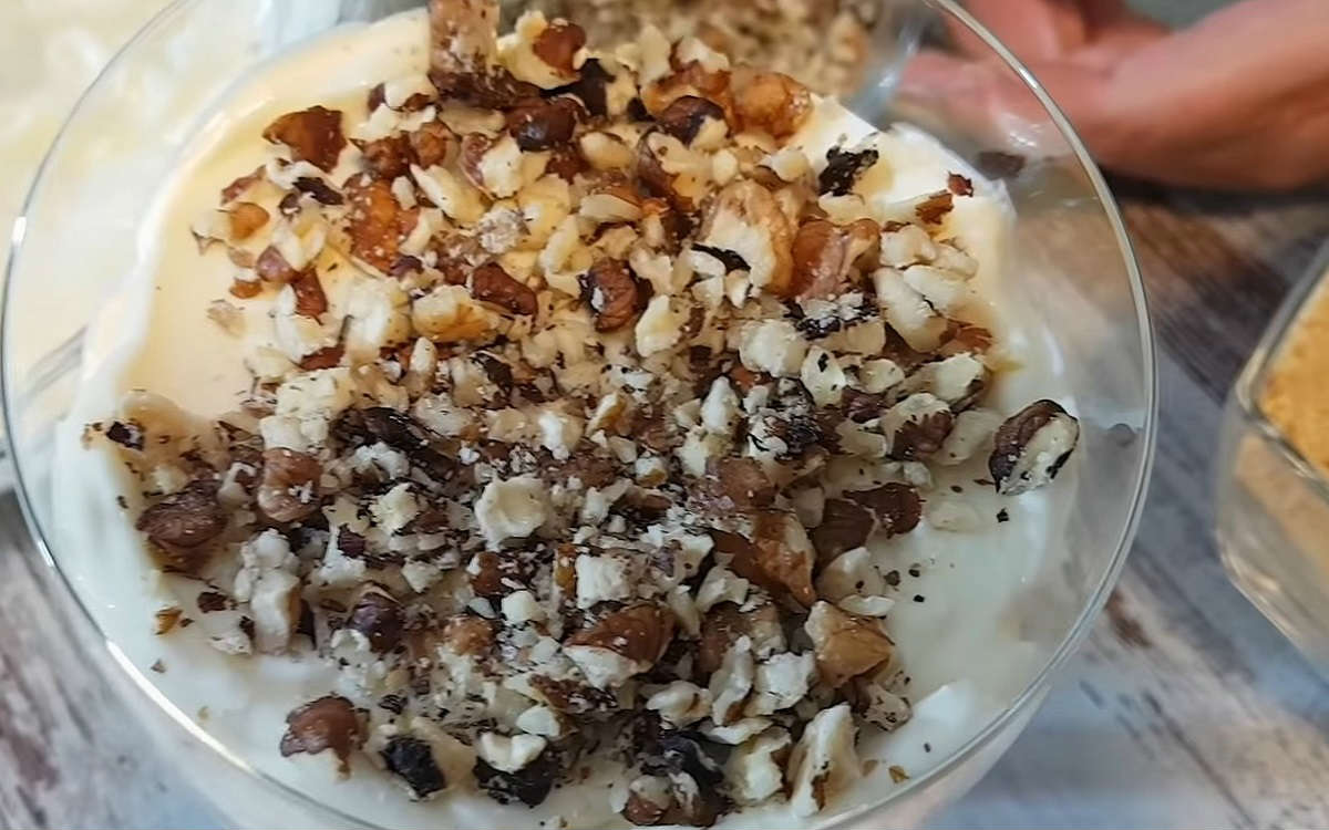 Całość ubijaj przez około 2 minuty, dodając stopniowo sok z cytryny. Na dnie pucharków ułóż warstwę biszkoptów. Na biszkoptach połóż zmielone orzechy i grubą warstwę ubitej śmietanki. Następnie na śmietankę połóż drugą warstwę biszkoptów, orzechów. Całość przykryj warstwą śmietany.