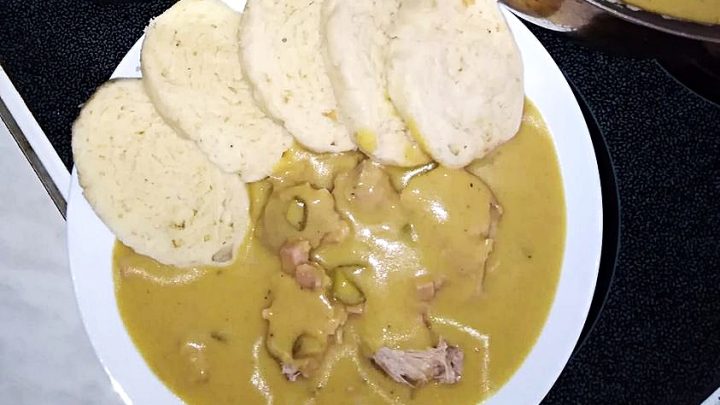 Do zmiksowanego sosu dodać odrobinę słodkiej śmietanki, łyżeczkę musztardy i szczyptę cukru, wszystko do smaku. Niech sos trochę się rozgrzeje na kuchence i podawaj z pokrojonym mięsem i domowymi knedlami z bułki.