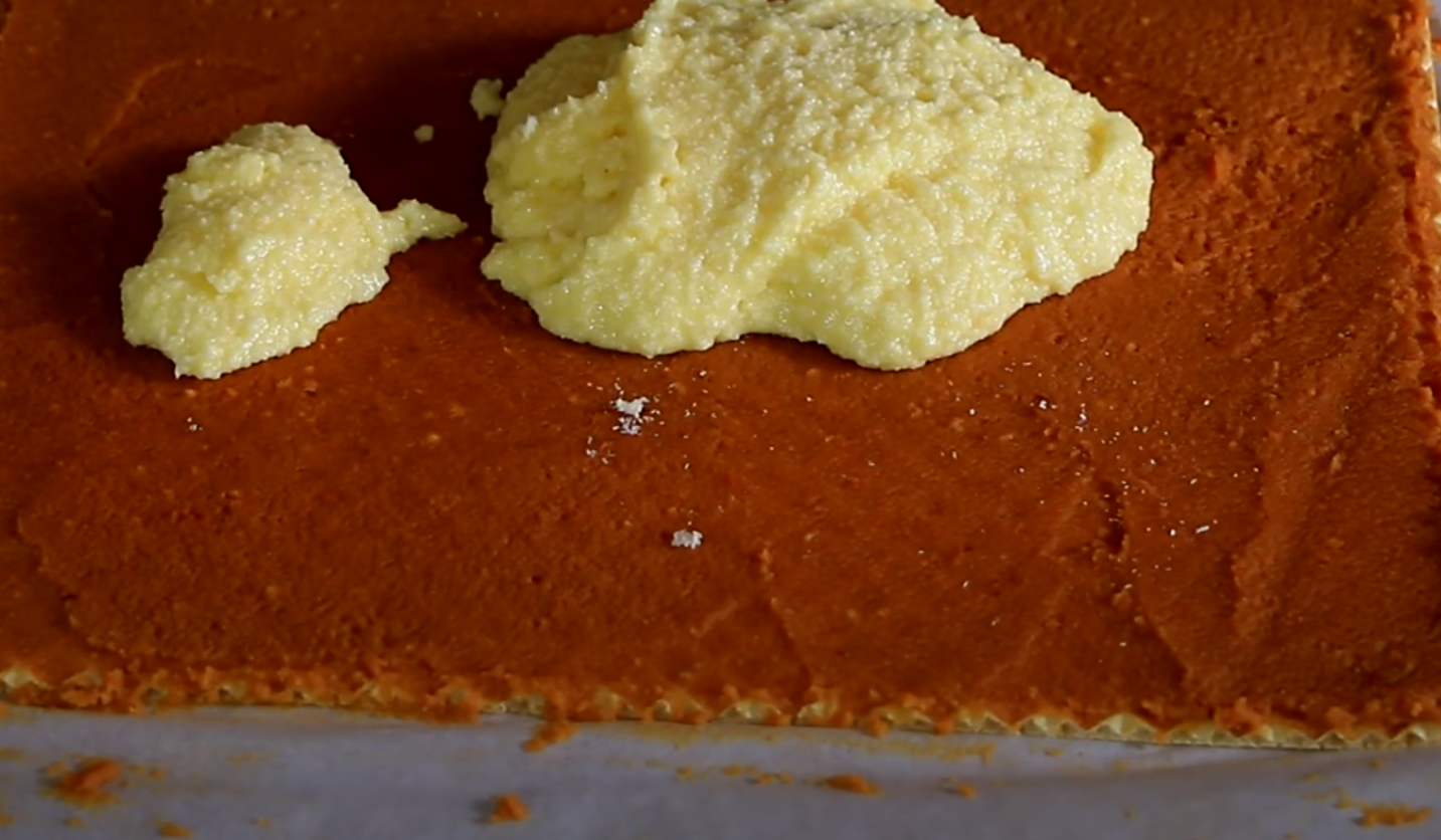 Następnie wsyp zmielone biszkopty i wymieszaj do uzyskania zwartej masy. Nałóż ją na miękki już wafel i równomiernie rozprowadź.