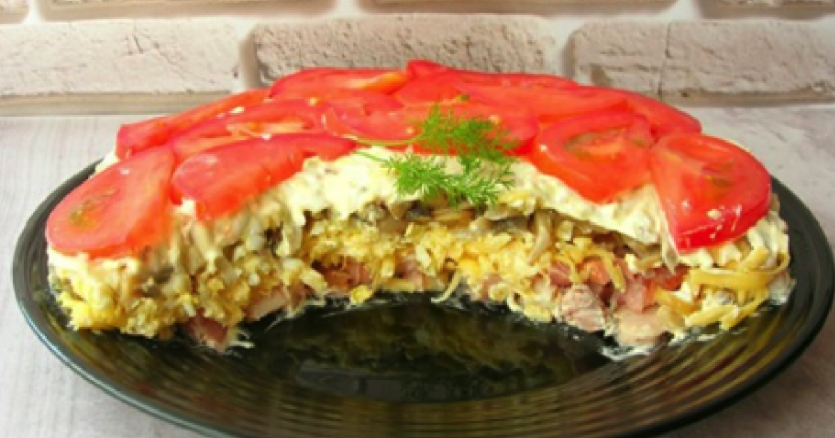 Rozłóż kurczaka, nasmaruj majonezem, a następnie posyp serem. Na to daj połowę pokrojonych jaj, jeszcze raz posmaruj majonezem i rozprowadź usmażoną cebulę z pieczarkami. Z pozostałych jaj ułóż warstwę, znów posmaruj majonezem, a na wierzch dodaj pomidory.