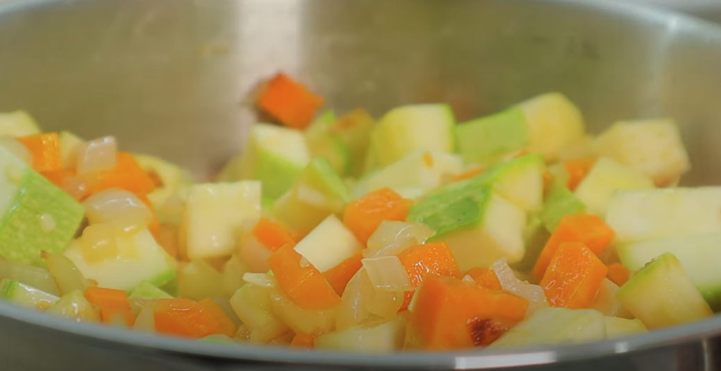 Na patelni rozgrzej oliwę z oliwek i dodaj drobno posiekaną cebulę. Smaż ją na średnim ogniu, aż stanie się miękka i lekko złocista. Dodaj startą marchewkę i smaż przez kilka minut, mieszając od czasu do czasu. Następnie dodaj pokrojone cukinie i dobrze wymieszaj. Przykryj patelnię pokrywką i gotuj przez 10 minut na małym ogniu.