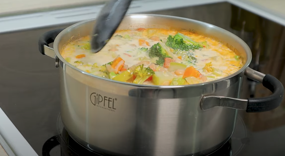 Dodaj pokrojone pomidory i zalej całość wodą. Przykryj pokrywką i gotuj przez 15 minut, aż warzywa zmiękną. Dodaj różyczki brokuła, wymieszaj i dopraw solą oraz czarnym pieprzem do smaku. Gotuj przez kilka minut, aż brokuły będą al dente. Dodaj puszkę odsączonej fasoli konserwowej oraz 200 ml śmietany. Gotuj przez kolejne 5 minut, aby smaki się połączyły.