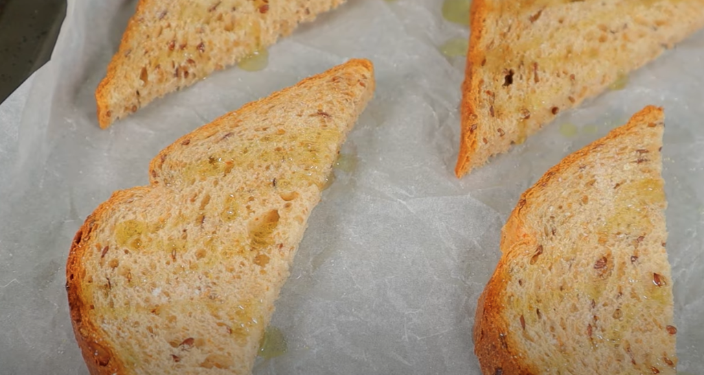 Na koniec posyp zupę świeżą pietruszką. Weź 3 kromki chleba i pokrój je na małe kawałki. Skrop oliwą z oliwek, posól i posyp suszonym czosnkiem. Piecz w piekarniku nagrzanym do 180°C przez 10 minut, aż chleb będzie chrupiący i złocisty.
