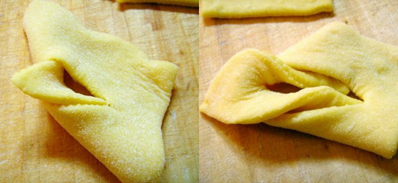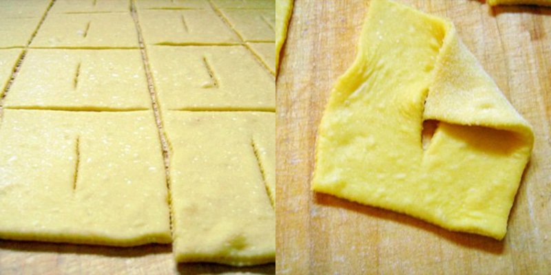 Na oprószonej mąką stolnicy rozwałkuj ciasto do oczekiwanej grubości (polecam ok. 0,5mm). Ostrym długim nożem potnij ciasto na paski wzdłuż i w poprzek, tak aby utworzyły się małe prostokąty.