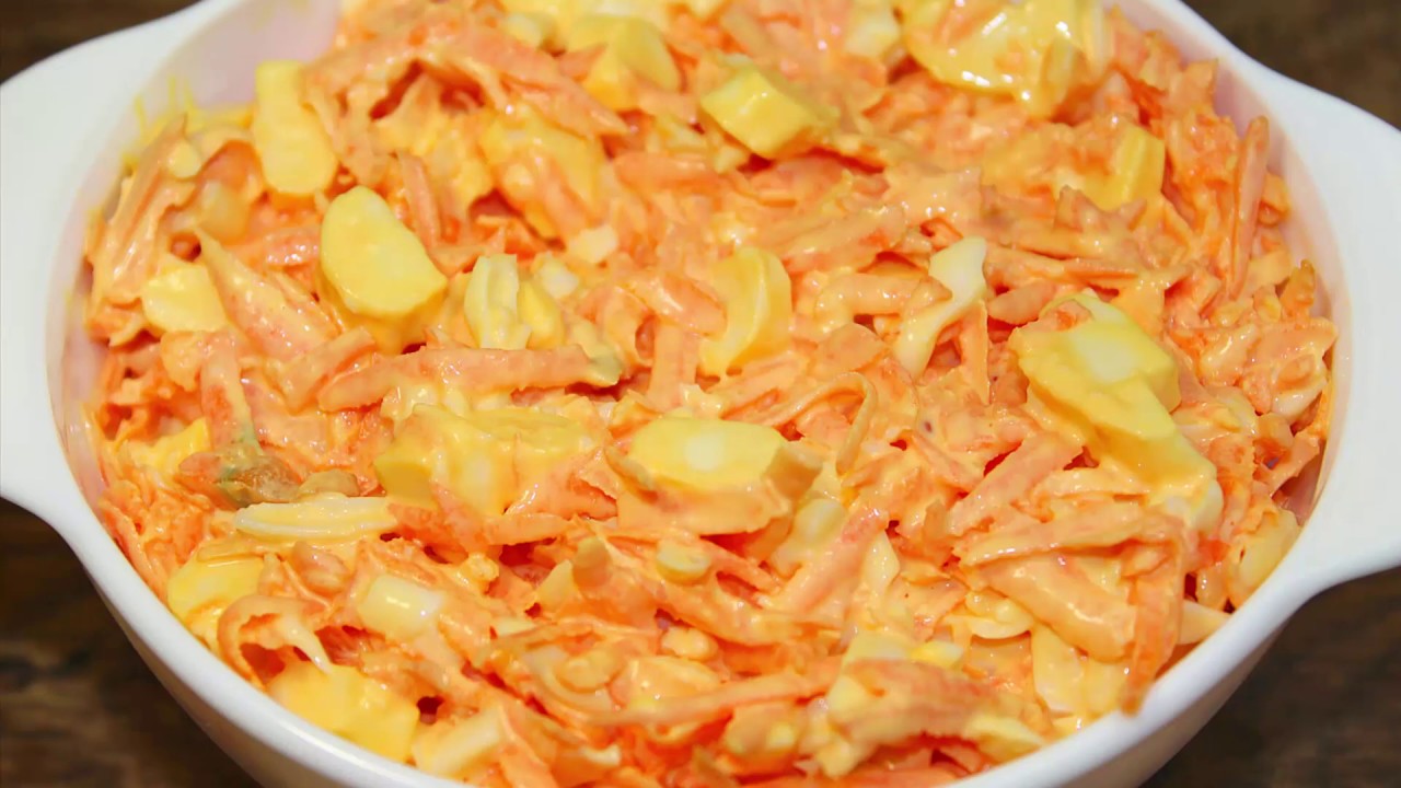 Gotujemy jajka. Po wystygnięciu, należy je obrać. Następnie obieramy marchewki. Gdy już będą gotowe, bierzemy tarkę i ścieramy je na dużych oczkach. Czosnek należy przecisnąć przez praskę i w takiej formie dodać do marchewek. Po wymieszaniu wkładamy je do lodówki w celu ich zmiękczenia oraz wypuszczenia soku.
