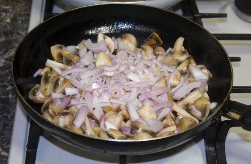 Cebulę pokrój na połówki, a pieczarki na cienkie plasterki. Podsmaż cebulę i pieczarki na maśle.