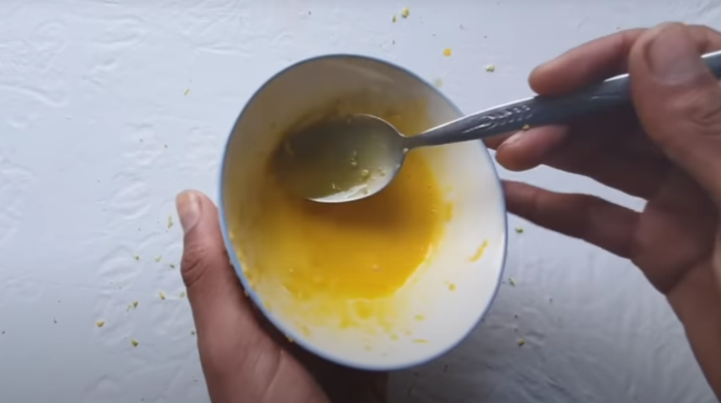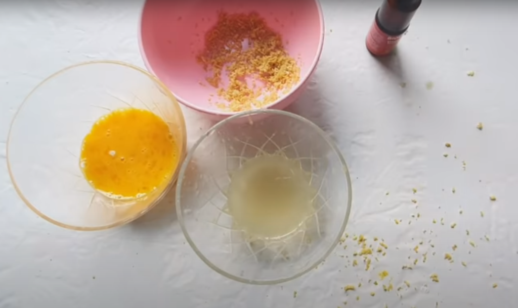 Cytrynę dokładnie umyj I zetrzyj z niej skórkę, następnie wyciśnij z niej cały sok. Przygotuj dwie miski. W jednej misce roztrzep widelcem jajko, do drogiej wlej 2 łyżki soku z cytryny i dodaj 2 łyżeczki startej skórki. Do rozbitego jajka dodaj 3 łyżki przygotowanej cytryny.