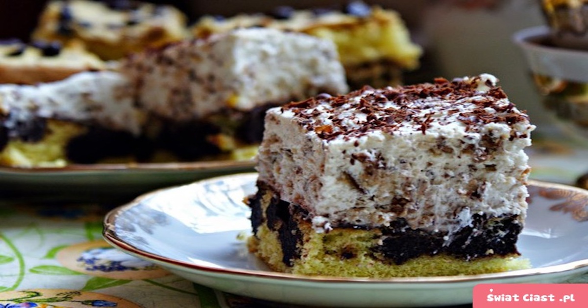 Słodką śmietankę ubić z usztywniaczem oraz cukrem pudrem na sztywną masę. Wyłożyć ją równomiernie na górę ciasta. Zetrzeć słodycze na wierzch. Wstawić do lodówki.