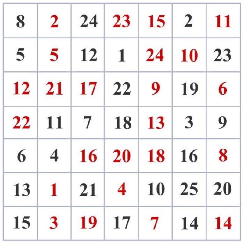 mata zawierająca cyfry. Celem zdania jest wykorzystanie maty z cyframi w zakresie od 1 do 25, a następnie umieszczenie jej w odległości podobnej do tej, podczas czytania książek. Należy patrzeć w środkowy punkt planszy, bez rozglądania się na boki, aby z pomocą widzenia peryferyjnego objąć wzrokiem wszystkie z dostępnych wariantów liczbowych.