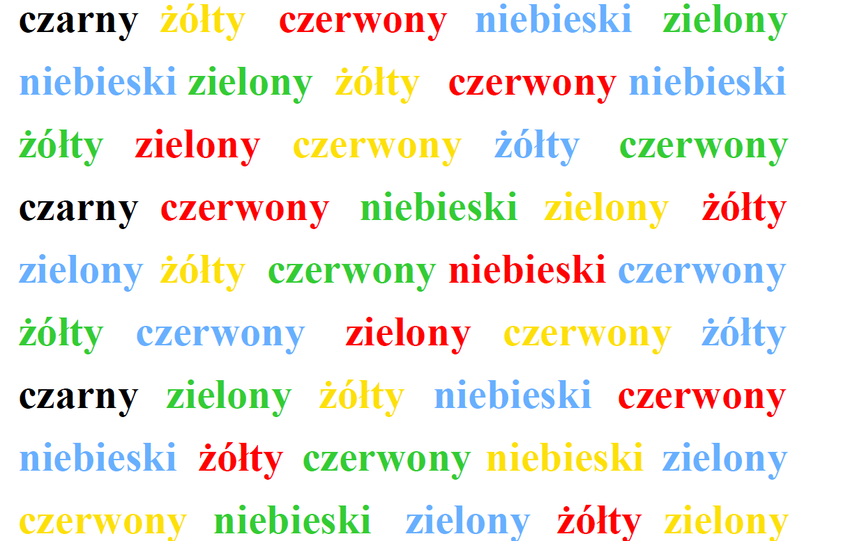 wypowiadanie słów napisanych w różnych wersjach kolorystycznych. Zadanie polega na głośnym czytaniu, jednak nie widzianego tekstu, a koloru w jakim dany wyraz został napisany. Co ciekawe, jest to spory wysiłek, ponieważ same wyrazy są określeniami słów, które często nie są zgodne z zabarwieniem literek, przez co mózg jest maksymalnie angażowany do zadania. Ćwiczenie należy wykonać dwa razy w ciągu jednej sesji, przy czym ten drugi raz w odwrotnej kolejności. Pomocne jest to w zapobieganiu wystąpienia Alzheimera.