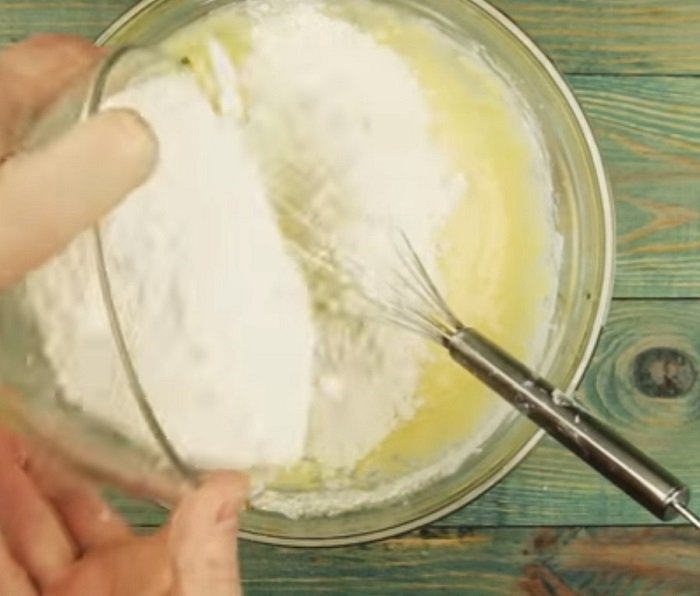 Jajka i cukier ubijamy dokładnie trzepaczką w misce, oraz dodajemy resztę składników, czyli dżem, kefir, sodę i mąkę. Ciasto należy dokładnie wymieszać, tak aby konsystencją przypominało gęstą śmietanę.