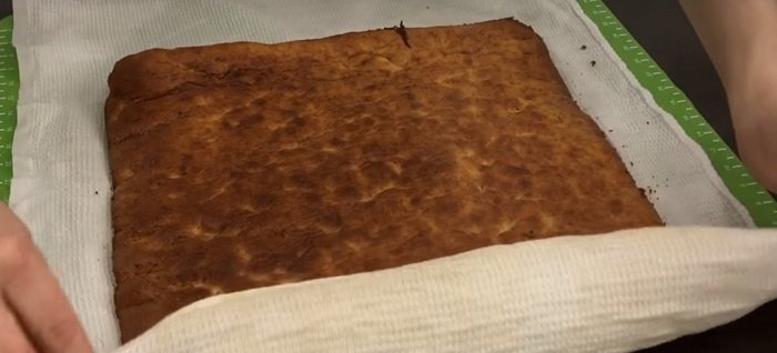 Przygotuj blachę z wysokimi brzegami, posmaruj olejem i wylej na nią ciasto. Włóż do nagrzanego piekarnika i piecz w temperaturze 180 stopni C przez ok. 25 minut. Po upieczeniu i ostygnięciu ciasto należy przekroić wzdłuż na cztery części, tak aby powstały oddzielne placki.