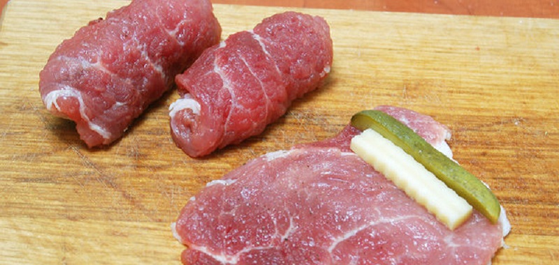 Bierzemy plasterek mięsa i na brzegu kładziemy po kawałku sera i ogórka. Zwijamy w rulonik i związujemy nitką (możemy dodatkowo zabezpieczyć koniec wykałaczkami). Całość powtarzamy do skończenia mięsa.