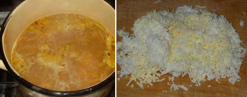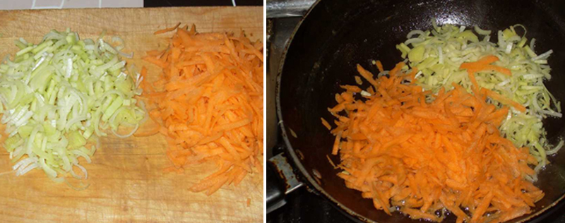 Na grubej tarce zetrzeć marchew i cebulę, obrać je i umyć. Pokrój ziemniaki w kostkę, ugotuj jajka na twardo. Lekko posmaruj warzywa masłem. Gdy marchew i cebula będą miękkie, wyłączyć kuchenkę.