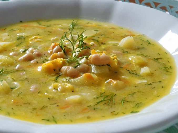 Gotuj około 10 minut i dodaj fasolę. Weź kilka łyżek zupy i wymieszaj ją z mlekiem. Wszystko wlewamy do zupy, a na koniec dodajemy lekko ubite jajko i nie mieszamy za bardzo, żeby pozostały większe kawałki. Na koniec dodajemy koperek i doprawiamy zupę szczyptą cukru i pieprzu.